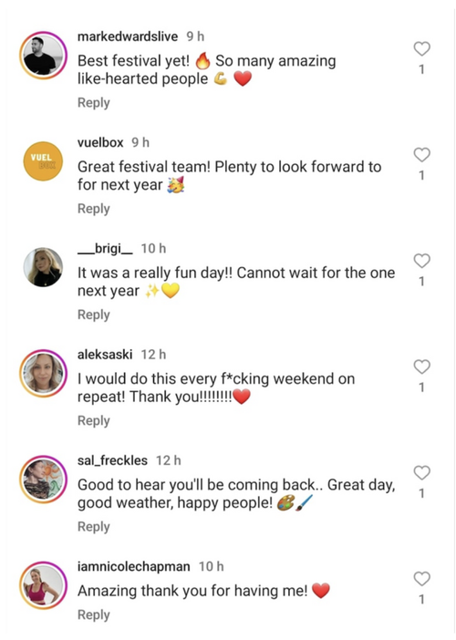 I was responsible for collaborating with individuals from Madeleine Shaw and Dr Alex George, to businesses like Symprove and Feel Good Club. I managed social posts and influencer marketing to spread the word about the festival. I was also responsible for creating webpages and managing the site to communicate the scheduling and artists to the festival goers in a user friendly way.